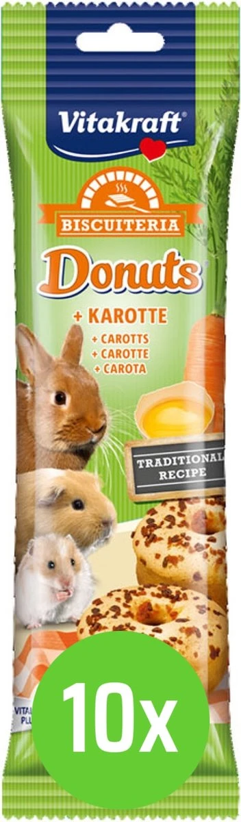 Lekkere biscuitsnack uit eigen bakkerij met smakelijke wortel. De lekkernij is bereid volgens traditioneel recept en bevat voedzame ingrediënten zoals eieren en meel. Een heerlijk tussendoortje voor alle knaagdieren en konijnen. Zonder kunstmatige kleurstoffen, aroma’s en conserveringsmiddelen. 4 Donuts per verpakking en Aroma Fresh verpakt zodat de Donuts lekker knapperig blijven.