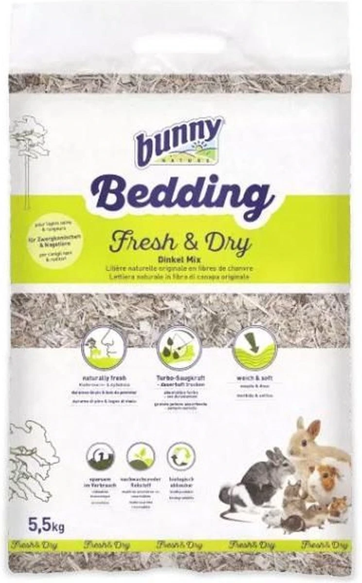 Bunny Nature Bunnybedding Fresh & Dry Speltmix 29 ltrDe Bunny Nature Bunnybedding Fresh & Dry Speltmix 29 ltr is een bodembedekker voor konijnenkooien en knaagdierkooien met een mix van spelt. Spelt is bijzonder geschikt als bodembedekker. Speltgraan is erg bijzonder. De schilvacht beschermt elke afzonderlijke korrel op de speltkorf tegen invloeden van buitenaf zoals het weer en schimmels. Ondanks deze beschermlaag zijn de speltkorrels thermisch gesteriliseerd. Daarnaast heeft het een buitengewoon goed absorberend vermogen. Het oppervlak zal hierdoor altijd droog zijn. Ook bindt het ammoniak enorm, wat positief is voor een goed binnenklimaat. Spelt is een duurzame grondstof dat erg zuinig is in gebruik. Het is biologisch afbreekbaar en enorm zacht. De Speltmix Bunnybedding bestaat uit vier waardevolle componenten, waaronder dennenhout en appelhout naast het spelt. Deze ingrediΓ«nten zijn natuurlijk en vers. β Bodembedekker voor knaagdier- en k