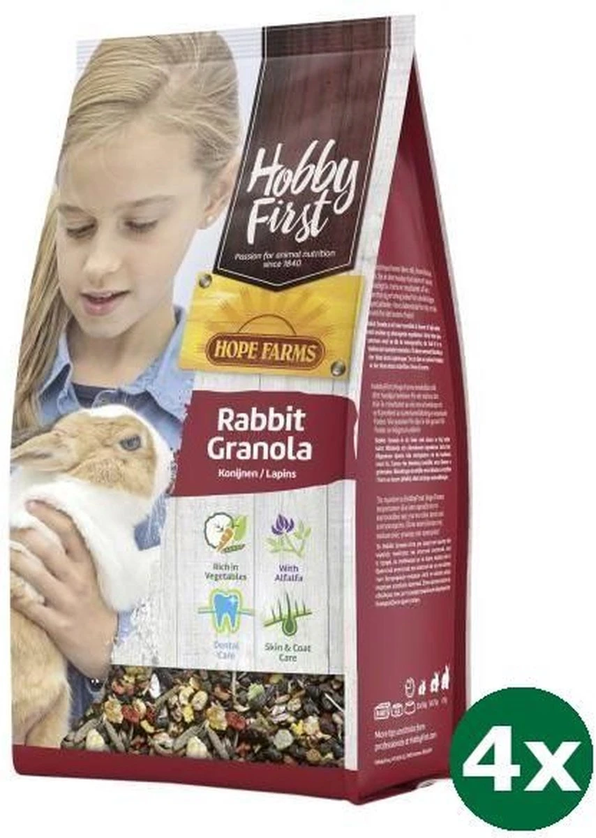 Hobbyfirst Hopefarms Rabbit Granola 800 gram Hobbyfirst Hopefarms Rabbit Granola van 800 gram is een gezond gemengd konijnenvoer met hoogwaardige ingrediènten dat rijk is in groenten en vezels. Dit smakelijke voer levert in combinatie met hooi alle benodigde voedingstoffen voor een lang en gezond konijnenleven. Er zijn extra groenten en daarnaast voedingsvezels in de vorm van luzerne (alfalfa) aan het voer toegevoegd om de spijsvertering te ondersteunen. Ook zorgen de brokjes voor een correcte afslijting van het gebit. Hobbyfirst Hopefarms Rabbit Granola is aanvullende diervoeding voor konijnen.- Gemengd voer voor konijnen- Met groenten en luzerne- Goed voor de spijsvertering en het afslijten van de tandenSamenstelling: luzerne 21%, maïs, erwtenvlokken 7.5%, zonnebloemzaadschroot, haverschillen, johannesbrood 4.0%, tarwevlokken, maisvlokken, zonnebloempitten, gerstvlokken, gepofte mais, gepofte tarwe, ha
