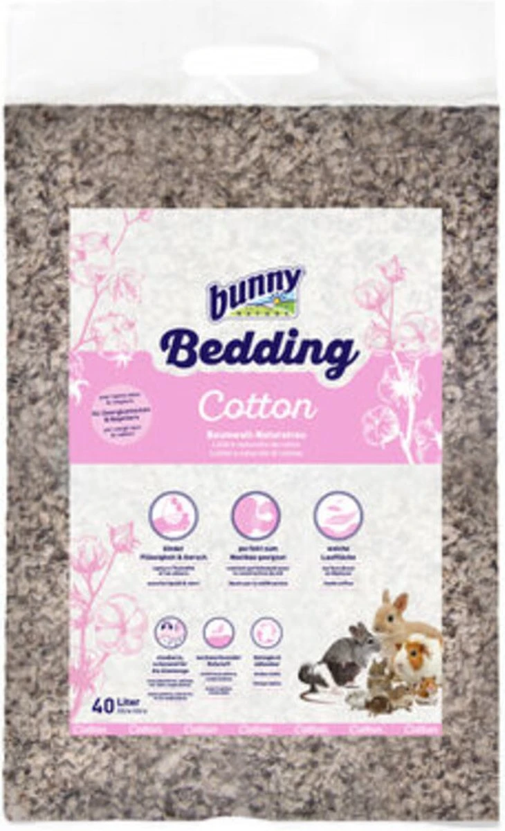 Bunny Nature Bunnybedding Cotton 40 literBunny Nature Bunnybedding Cotton 40 liter is een natuurlijke bodembedekking van katoen voor konijnen en knaagdieren, zeer zacht en bijzonder geschikt voor het bouwen van nesten en gangen. Zo zorg je voor een prettige ondergrond in de kooi van jouw konijn, cavia, hamster of andere kleine huisdier. Bunnybedding Cotton is door de structuur zeer zacht voor de poten en daarnaast stofarm, wat luchtwegproblemen helpt te voorkomen. Het materiaal bindt vloeistof en geur voor een langer fris ruikende kooi. Je kunt Bunny Cotton alleen gebruiken, maar ook in combinatie met andere bodembedekkers. Bunny Cotton leent zich bijzonder goed voor het bouwen van nesten en gangenstelsels. Het is een recyclebare grondstof die biologisch afbreekbaar is en dus ook beter voor het milieu. – Bodembedekking voor konijnen, cavia’s, hamsters en andere kleine knaagdieren- Zeer zacht van structuur, zacht voor de poten en om op te lig
