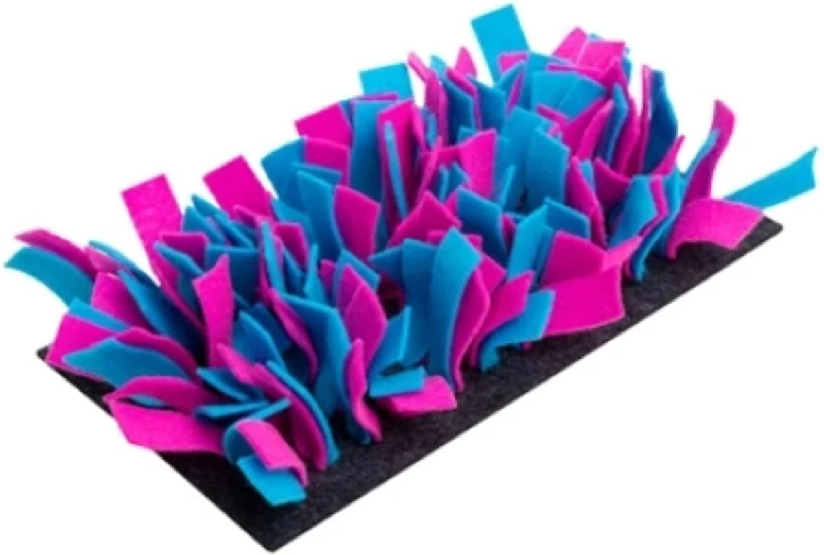 De Bunny Nature Snuffelmat Vilt Turquoise / Roze is interactief speelgoed voor konijnen, caviaβs, ratten, hamsters en andere knaagdieren, voor fysieke en mentale uitdaging met snacks als beloning. Jouw konijn of kleine knager hoeft zich niet meer te vervelen met deze leuke Snuffelmat van Bunny Nature! Konijnen en andere knaagdieren als caviaβs, ratten, hamsters en muizen foerageren in de natuur veel op zoek naar voedsel, waarmee zij uren per dag bezig zijn. Jij kunt nu aan die behoefte voldoen met deze vrolijk gekleurde snuffelmat. De snuffelmat is gemaakt van vilt en bestaat uit een bodem met daarop slierten waartussen snacks en voer verstopt kunnen worden. Jouw dier zal al zijn zintuigen aan moeten spreken om de verstopte lekkernijen tussen de slierten te vinden. Jouw dier is zo actief bezig met het zoeken naar zijn beloning, wat verveling tegengaat en zorgt voor mentale uitdaging. Door jouw dier te begeleiden bij het zoeken naar zijn beloning en samen te spelen, versterk je bovendien de onderlinge band.