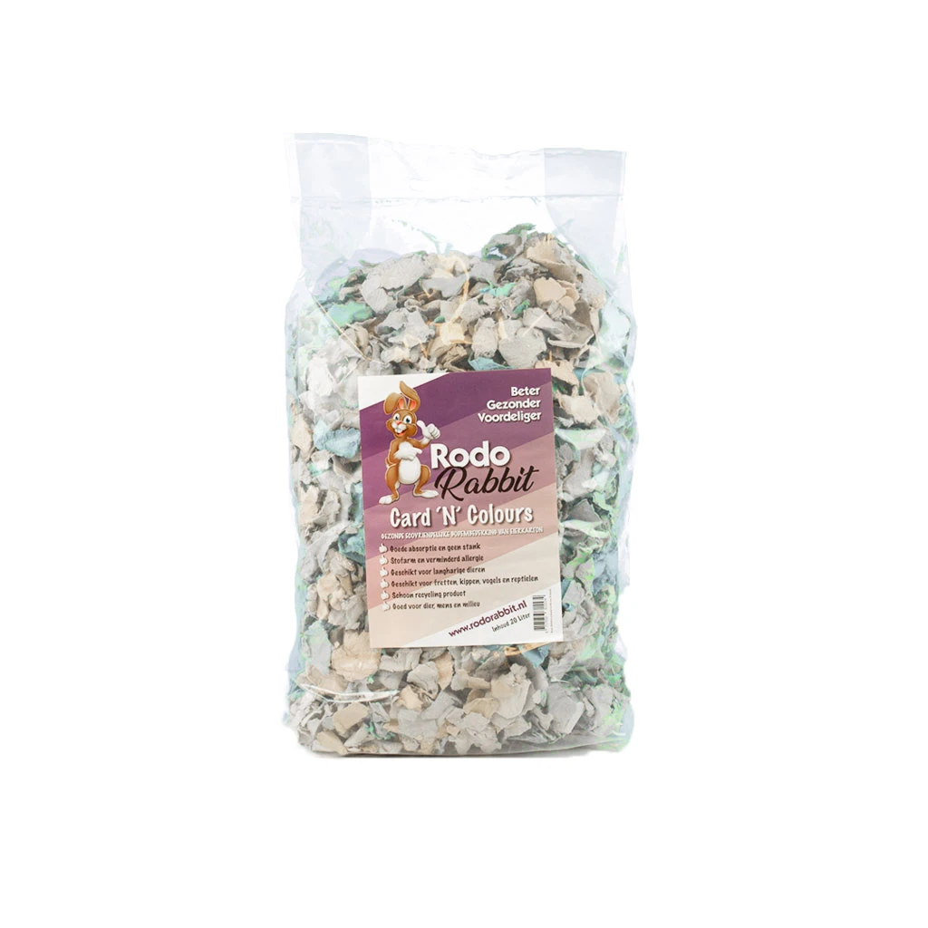 Card ‘N Colours- Inhoud: 20 L of 150 L Deze bodembedekking is gemaakt van kleine stukjes eierdoos afkomstig van overproductie. Dit restproduct is een zachte en luchtige bodembedekking. Deze bodembedekking is stofvrij en absorbeert heel goed. Het is ook zeer geschikt voor langharige dieren.