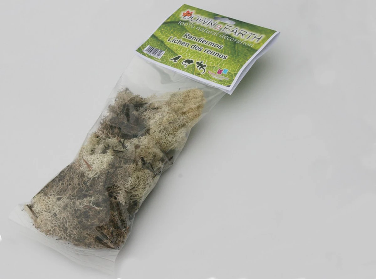 Gedroogd rendiermos. Ideaal voor hamsterscaping. Decoratief, veilig en geschikt als nestmatriaal. Door het droogproces bevinden zich er geen insecten of parasieten meer in het mos.