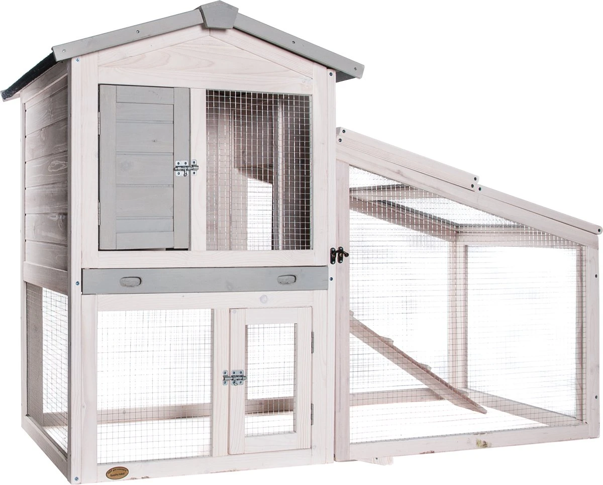 Dit compacte konijnenhok, nu in nieuwe kleurstelling! Met handige deuropeningen, een ren die losgekoppeld kan worden en een openslaand dak van de ren. Geschikt voor max. 2 dwergkonijntjes.