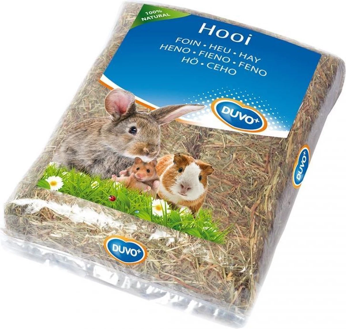 Hooi van Duvo+ is een natuurlijke hooisoort en is de basis van het dagelijks rantsoen van uw konijn of knaagdier en moet dus van goede kwaliteit zijn. Hooi bevat zeer veel vezels en andere belangrijke voedingsstoffen die een knaagdier nodig heeft en zorgt hierdoor voor een goede darmflora. Verder is hooi onmisbaar om het gebit van uw konijn of knaagdier op natuurlijke wijze te laten slijten. Dit voorkomt haken aan de kiezen en voortanden.