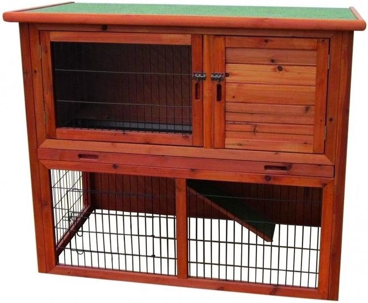 2 verdiepingenTrapjeSchuifslotenNachthok aanwezigSchuifladeAfmeting: 104x52x97CM Het Woodland konijnenhok Redmond Classic van Duvo+ is een zeer stevig en degelijk konijnenhok met 2 verdiepingen. Op de bovenverdieping bevindt zich een open ruimte en een nachthok, en op de benedenverdieping bevindt zich een zeer ruime ren waarin uw konijn naar hartelust kan rondhuppelen.