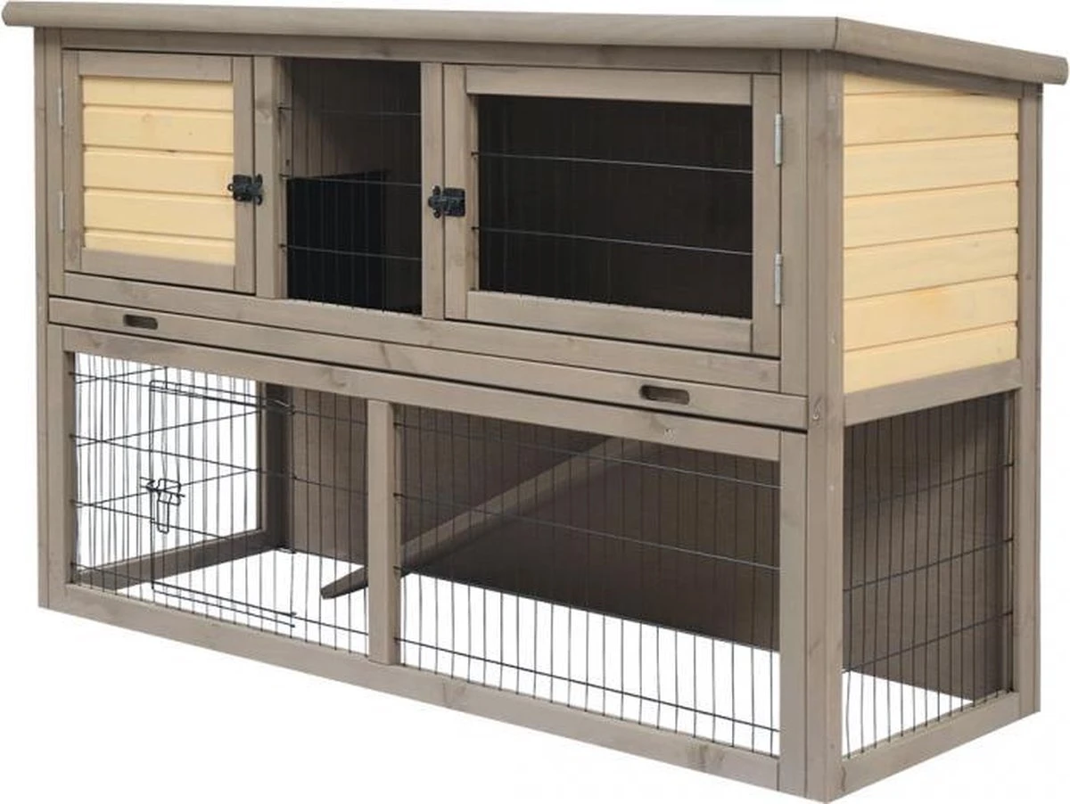 Het Woodland konijnenhok Bel-Étage Country van Duvo+ is een zeer stevig en degelijk konijnenhok met 2 verdiepingen. Op de bovenverdieping bevindt zich een open ruimte en een nachthok, en op de benedenverdieping bevindt zich een zeer ruime ren waarin uw konijn naar hartelust kan rondhuppelen. Een handige mestafvoerschuif houdt de bovenverdieping proper. Er zijn 3 mogelijke toegangen en daarenboven kan het dak gekanteld worden zodat alles nog beter in bereik is. Het hok is al éénmalig gebeitst maar wij adviseren u om dit periodiek te herhalen ter bevordering van de duurzaamheid.