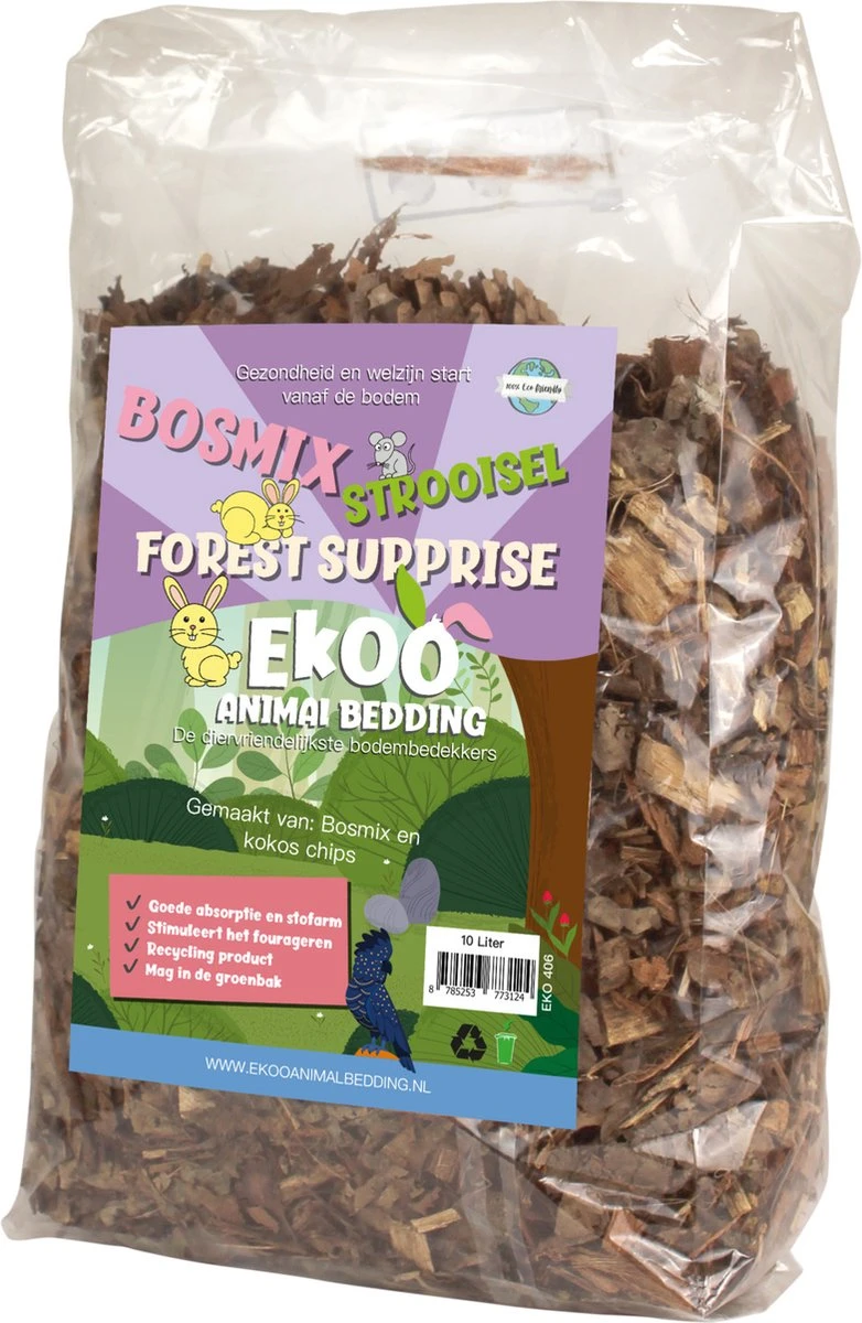 Dit Bosmix Strooisel van Ekoo dient als bodembedekking voor knaagdierverblijven. De mix bestaat uit een mengsel van bos bodem en kokos chips. Deze mix stimuleert het fourageren en is zeer geschikt om mee te spelen en om in te verstoppen.
