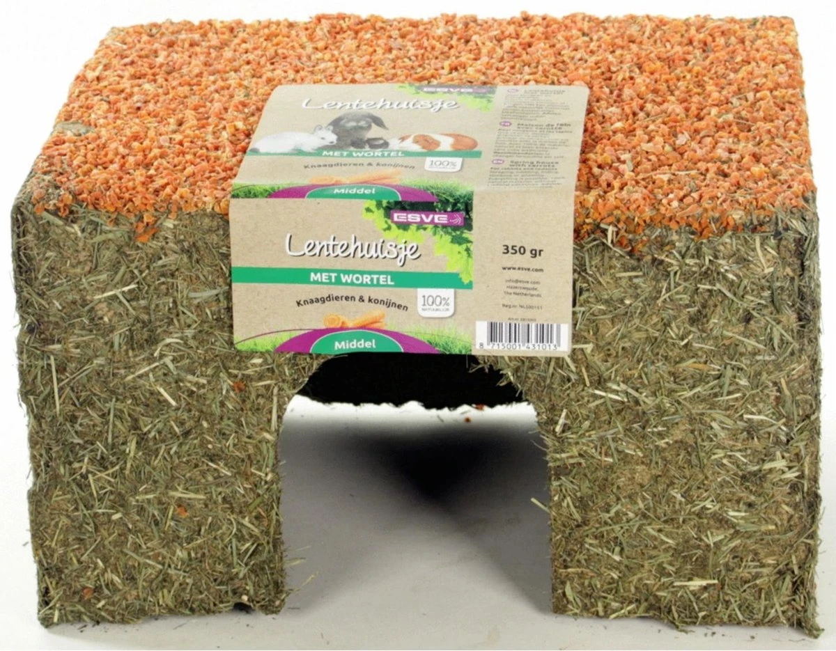 Verveling, gebrek aan knaaghout en goede voeding bij knaagdieren en konijnen, leiden vaak tot afwijkend gedrag en vachtproblemen. Met het ESVE Lentehuis hoeft het dier zich niet meer te vervelen. Slapen, knabbelen, verstoppen, klimmen of knagen, het kan allemaal! Lentehuisjes zijn gemaakt van 100% natuurlijke materialen en zonder kunstmatige kleefstoffen. 27cm breedVoedingsadvies: Wanneer het huisje verontreinigd is, deze vervangen.Samenstelling: Wieidehooi, gedroogde wortel, karton