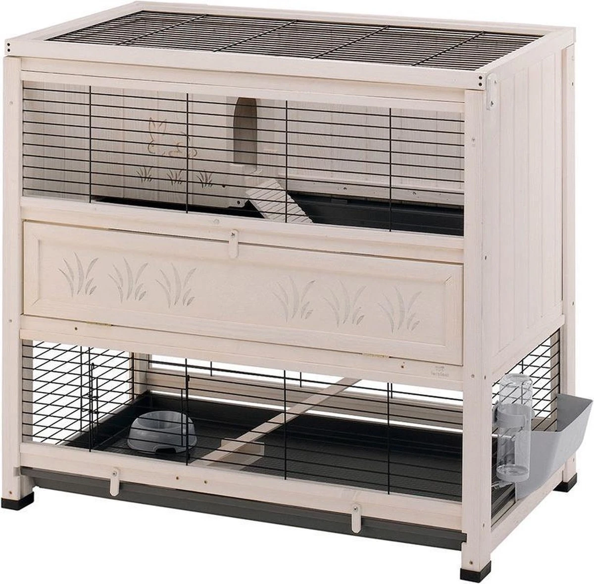 De Cottage heeft praktisch uitneembare schuiflades die je gemakkelijk en snel kunt schoonmaken. Dit konijnenhok wordt compleet geleverd inclusief accessoires zoals een voerbakje, drinkflesje, hooiruif en een houten ladder om bij de bovenste verdieping te komen.