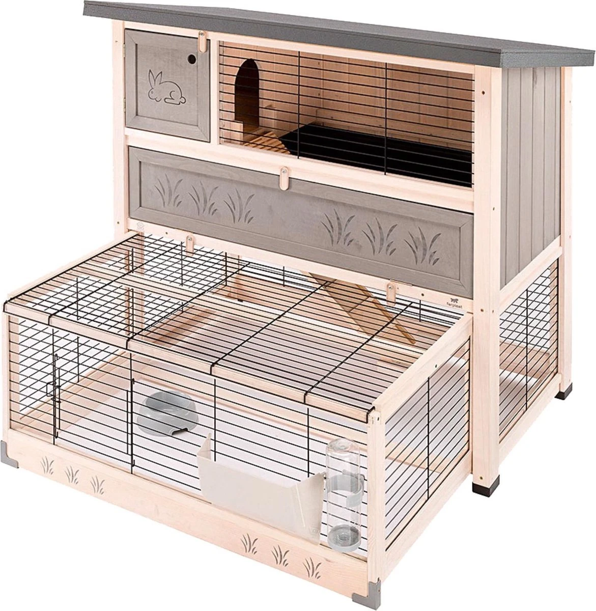 Het nachthok is gemaakt van hout en heeft een handig te openen zijdeur zodat je makkelijk bij het verblijf kan komen en het beschikt over een efficiënt en veilig sluitsysteem. De onderste helft van het hok dient als een ren waarin je konijnen vrij kunnen spelen, eten en drinken. Via het schuifdeurtje kunnen je konijnen uit het verblijf en kunnen ze vrij rondlopen in je tuin of huis.