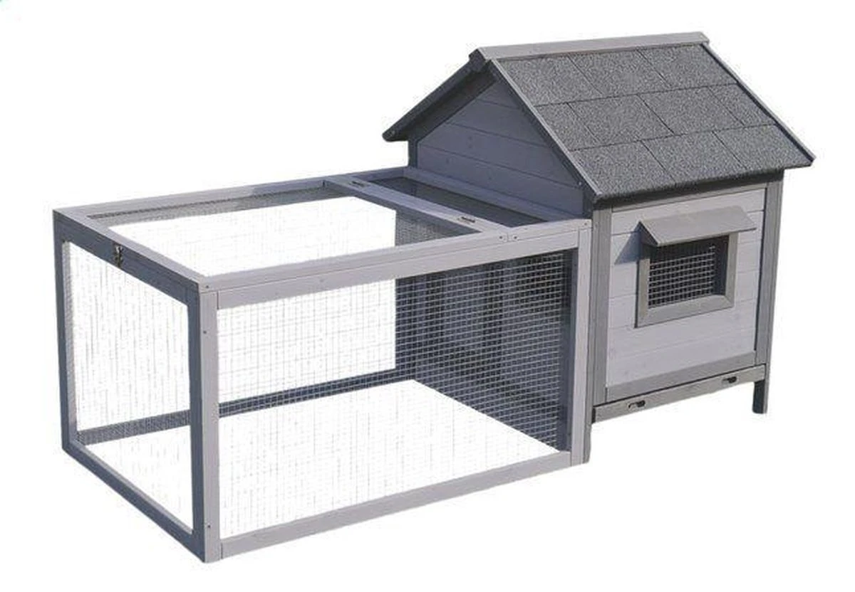 Dit compacte konijnverblijf heeft een unieke uitstraling. Een nachthok welke mogelijkheid biedt tot toegang van diverse kanten en een open klapbare ren maken het tot een compleet konijnenverblijf. Het nachtverblijf beschikt over een uitschuifbare mestlade wat het schoonmaken van het hok enorm vereenvoudigd. Tevens beschikt het nachthok over een ventilatie rooster welke bij wind/regen en tocht gedeeltelijk afgedekt wordt door middel van een afdakje. Konijnen zijn energieke dieren wij adviseren je bij gebruik van een dergelijk verblijf voldoende los loop tijd te bieden aan de konijnen.