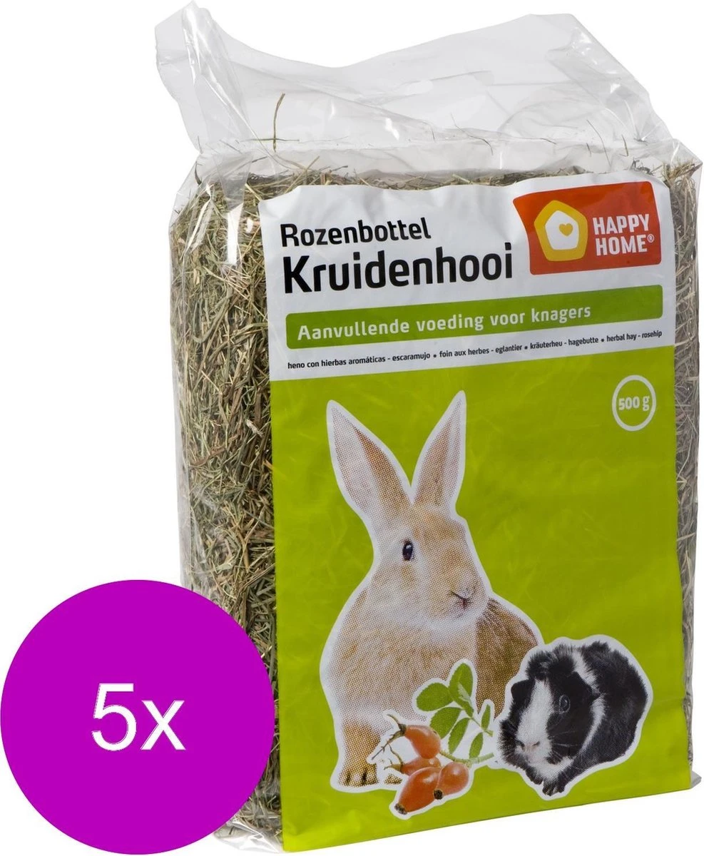 Hooi is een natuurlijk product. Het is een belangrijk bestanddeel van het voedsel van alle plantenetende knaagdieren en konijnen. Het zorgt met zijn hoge gehalte aan ruwe vezels voor een goede spijsvertering bij de dieren.br /Hooi is een gezonde en natuurlijke verrijking van het dagelijkse menu van uw dier. Een konijn mag onbeperkt happy home hooi eten.br /-Paardebloembr /-Kamillebr /-Rozenbottel