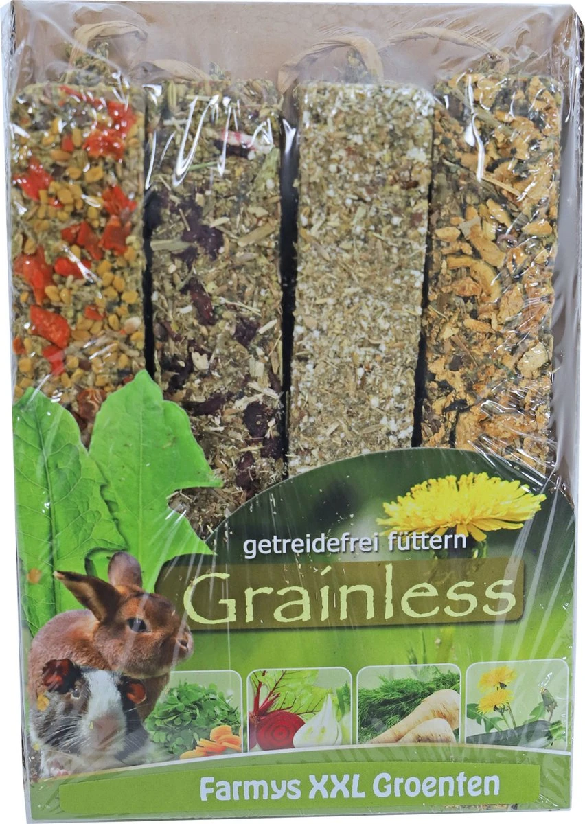 JR FARM Grainless Farmys veggies pakket bestaande uit XXL sticks is geschikt voor alle knaagdieren en konijnen. Deze Grainless Farmys zijn graanvrij en vrij van suikerrijke ingrediënten. Deze Farmy knaagsticks XXL zijn groter dan de ‘normale’ versie, de normale is namelijk 70 gram per stick, en de XXL zijn 112,5 gram per stick. Elke stick heeft een andere smaak; wortel – fenegriek, rode biet – venkel, pastinaak – dille of courgette – paardenbloem.