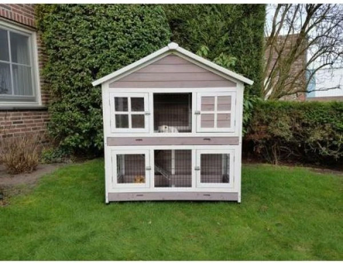 Konijnenhok Double Deluxe – Afmetingen: 125 x 67 x 133cm – Met anti-knaagstrips Konijnenhok Double Deluxe is een plaatje om te zien. De twee verdiepingen zorgen voor een speels effect en genoeg bewegingsvrijheid. Daarnaast is het hok ook nog eens uit te breiden met een of twee rennen. Het konijnenhok beschikt over twee diepe lades voor het makkelijk schoonmaken en maar liefst 4 deuren. Hierdoor kan je ten alle tijden bij je konijn. De zijpanelen van de onderste verdieping zijn tevens uitneembaar voor als je er een extra ren aan wilt koppelen. De bovenverdieping heeft rechts een apart nachthok en het linkerdeurtje is voorzien van plexiglas voor extra beschutting, maar wel voldoende lichtinval. De onder verdieping is op de randen voorzien van knaagstrips. Hoeveel konijnen passen in dit hok? Alle maten Onderdeel hok Afmet