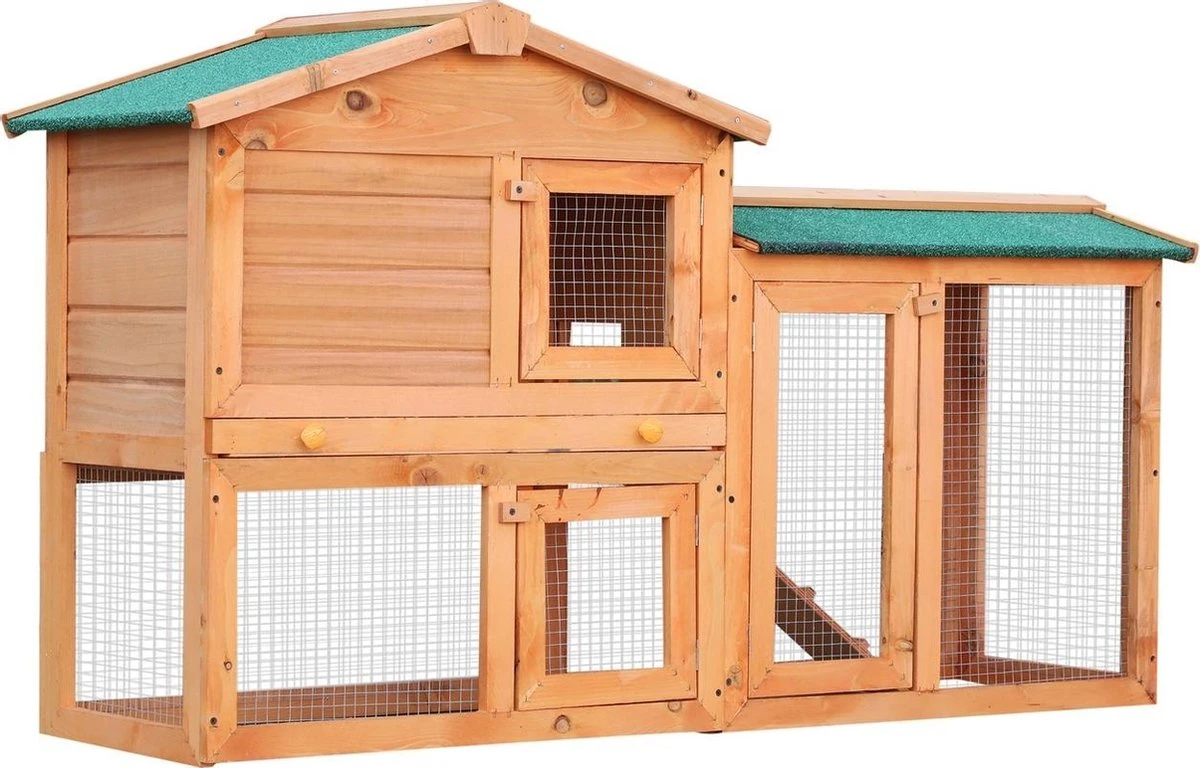 Het dak, voorzien van bitumenfolie, biedt ook bij slecht weer een veilig onderkomen. Het ruime openluchtverblijf zorgt ervoor dat dieren lekker van de frisse lucht kunnen genieten.