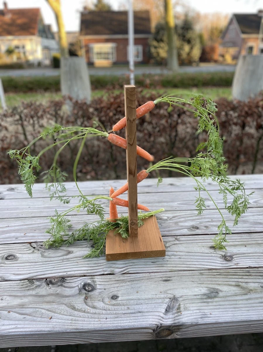 Deze voederpaal is zeer geschikt om uw konijn elke dag weer te voorzien van verse groentes. Op de foto’s ziet u wortels maar het is ook geschikt voor andere groentes. Het konijn op de foto is een franse hangoor. Ook is deze voederpaal handgemaakt en duurzaam.