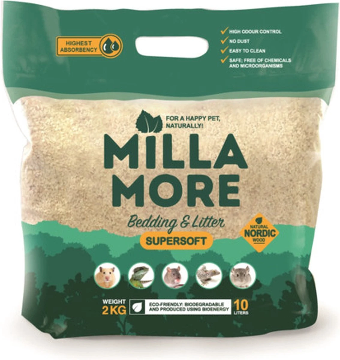 MILLAMORE beddengoed is speciaal gemaakt voor gebruik met dieren. Het heeft een uitstekend absorptievermogen en geurcontrole. De producten zijn veilig en getest in een laboratorium – het hout bevat geen pathogene bacteriën of giftige chemische verbindingen. De producten zijn stofvrij en gemaakt van espenhout met een zeer laag harsgehalte. De producten bevatten geen chemische toevoegingen of restanten uit de hout- of papierindustrie.