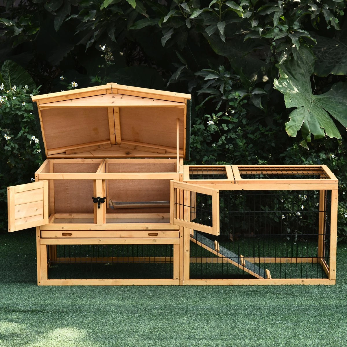 Kies ons huisdierenhuis en geef jouw konijn of andere kleine dieren een geweldige woon-/ speel-/ trainingsruimte. Dankzij de meerdere ingangen kun je het hok gemakkelijk schoonmaken of jouw konijnen voeren. Het hok kan hij bij slecht weer buiten worden gebruikt: het heeft een stevige constructie (100% massief hout) en het lakwerk is waterbestendig. Jij en je huisdieren hebben er jarenlang plezier van. Eigenschappen: · Ontwerp met 2 verdiepingen, dus veel ruimte · Overdekte leefruimte, ruimte ernaast en eronder om te rennen en te spelen · Huis is van 100% massief hout: natuurlijke uitstraling en stevig · Door de stevige tralies kunt u uw kleine dieren goed bekijken · Meerdere deuren, dus gemakkelijke toegang · Veilig: deuren met vergrendeling · Geïntegreerde uitschuifbare bak onder de hoofdruimte voor eenvoudige reiniging · Deze kooi met UV-bestendig asfaltdak en waterafstotend lakwerk is geschikt voor gebruik buiten · Loopplank zorgt ervoor dat jouw huisdieren gemakkelijk naar binnen kunnen · Eenvoudig te monteren Technische gegevens: · Materiaal: vurenhout, metaal, asfalt · Afmetingen hoofdruimte: 71,8 l x 44 b x 42,5 h cm · Afmetingen rechter box: 75 l x 44 b x 53 h cm · Afmetingen onderste box: 71,8 l x 44 b x 25,7 h cm · Afmetingen loopplank: 49,5 l x 16 b cm · Afmetingen deur: 24,3 b x 21,5 h cm · Afmetingen raam: 33,8 b x 21,5 h cm · Kleur: naturel, groen · Netto gewicht: 15,8 kg · Omvang van de levering: 1 x konijnenhok · Verzendbriefje: Geen verzending naar Nederlandse eilanden.