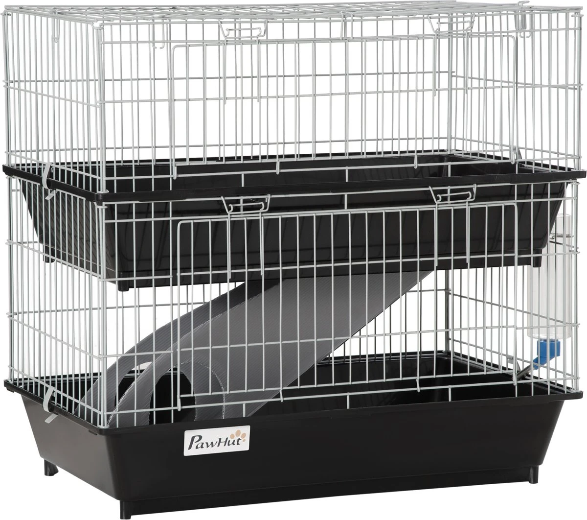 De PawHut kooi voor kleine huisdieren is het perfecte huis voor kleine huisdieren zoals konijnen en cavia’s. Het stevige ontwerp heeft 2 grote deuren, zodat je gemakkelijk bij je huisdier kunt komen. 2 diepe bakken, zodat je huisdier genoeg leef- en speelruimte heeft. Een helling en een platform maken de kooi compleet. Zorg dat ze veilig zijn, bescherm ze, maar houd ze ook actief en bezig voor een lang en leefbaar leven. Eigenschappen: · Ideaal voor kleine konijnen, nertsen, chinchilla’s, cavia’s en andere kleine huisdieren van vergelijkbare grootte · 2 deuren, zodat je gemakkelijk bij je dieren in het verblijf kunt komen · Gemaakt van metaaldraad van hoge kwaliteit, dat duurzaam is en dus lang meegaat · 2 diepe bakken, zodat je huisdier genoeg leef· en speelruimte heeft · Een helling, drinkfles en voerbak zijn inbegrepen · De tralie-afstand zorgt voor een goede ventilatie · Eenvoudige montage vereist Technische gegevens: · Kleur: blauw+grijs · Materiaal: Staal, PP · Totale afmetingen: 72 l x 44 b x 67 h cm · Afmetingen deur: 50 b x 24 h cm · Afmetingen kunststof bak: 66 l x 40 b x 14 h cm · Afmetingen helling: 52 l x 12 b cm · Afmetingen voerbak: 13 l x 13 b x 4,5 h cm · Inhoud drinkfles: 475 ml/16 oz Tip: Deze kooi voor kleine huisdieren is niet geschikt voor hamsters of ratten · Omvang van de levering: 1 x kooi voor kleine huisdieren · Verzendbriefje: Geen verzending naar Nederlandse eilanden.