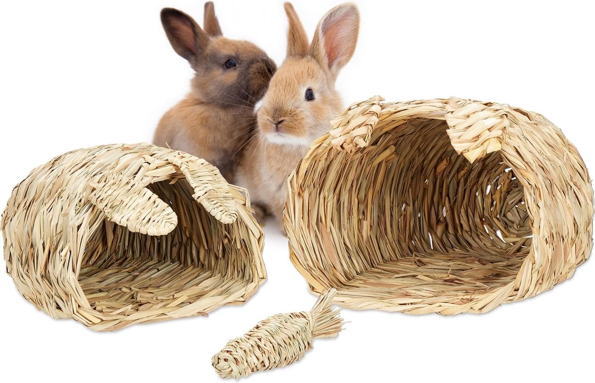 Bied je knagers een gevarieerd verblijf om te spelen, knabbelen en schuilen met deze 3-delige set van knaagdier speelgoed. De grashuizen in 2 verschillende groottes zijn een comfortabele schuilplek voor je lievelingen. De kleine konijnenoortjes verleiden de dieren om te gaan spelen en knabbelen. Je diertjes kunnen zonder problemen aan het konijnen speeltje in de vorm van een wortel knagen want deze is – net zoals de andere toebehoren – volledig gemaakt van natuurlijke materialen.