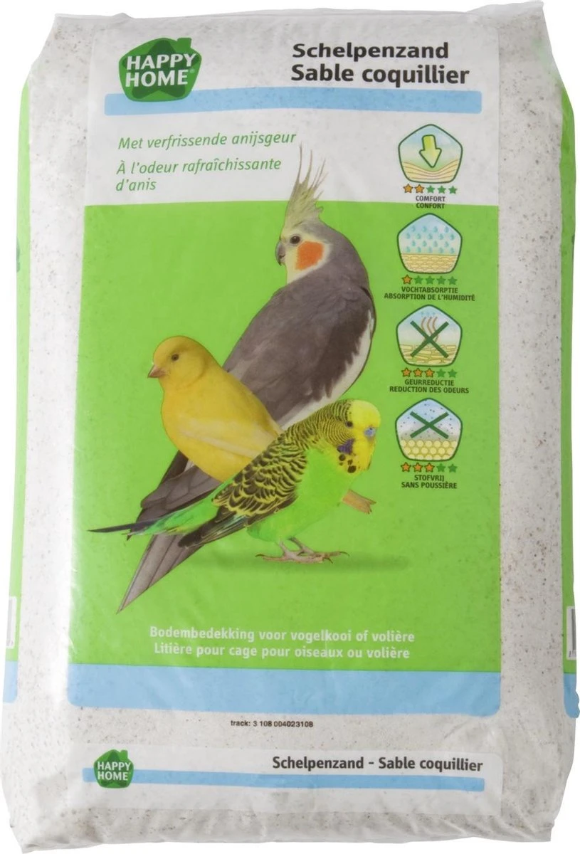 Schelpenzand is onmisbaar in iedere vogelkooi, het bevordert namelijk de hygiëne. Happy Home Schelpenzand is een mengeling van gezuiverd wit zand met oester- en zeeschelpjes. Ook is er anijs toegevoegd voor een lekkere, frisse geur.