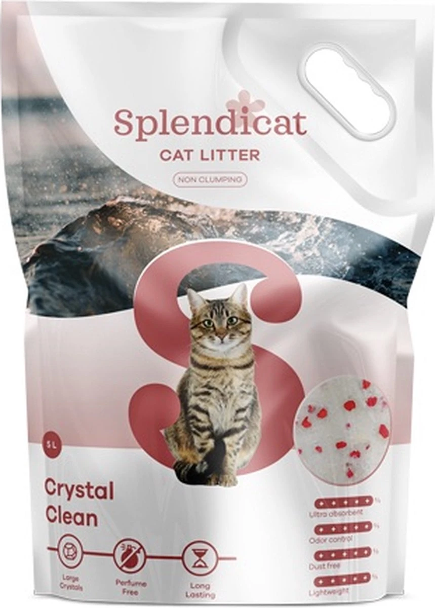 Splendicat Crystal Clean is een niet-klontvormende, lichtgewicht kattenbakvulling gemaakt van silicaatkristallen. De kristallen zijn ultra absorberend. Zodra vloeistof in contact komt met de kristallen wordt het volledig opgenomen, geneutraliseerd en vervolgens verdampt, waardoor de kristallen opnieuw vloeistof kunnen opnemen.