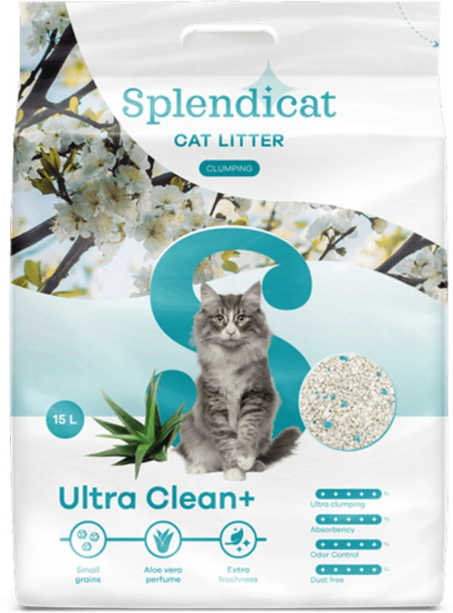 Splendicat Ultra Clean+ is een hoogwaardig klontvormende kattenbakvulling van natuurlijke witte klei. De fijne korrels zijn ultra absorberend en zorgen voor sterke klontjes zodra ze in contact komen met vloeistof. De klontjes zijn gemakkelijk met een schepje uit de kattenbak te verwijderen. De blauwe hygiëne korrels en de toevoeging van een aloë vera parfum zorgen voor extra frisheid en een schone kattenbak.