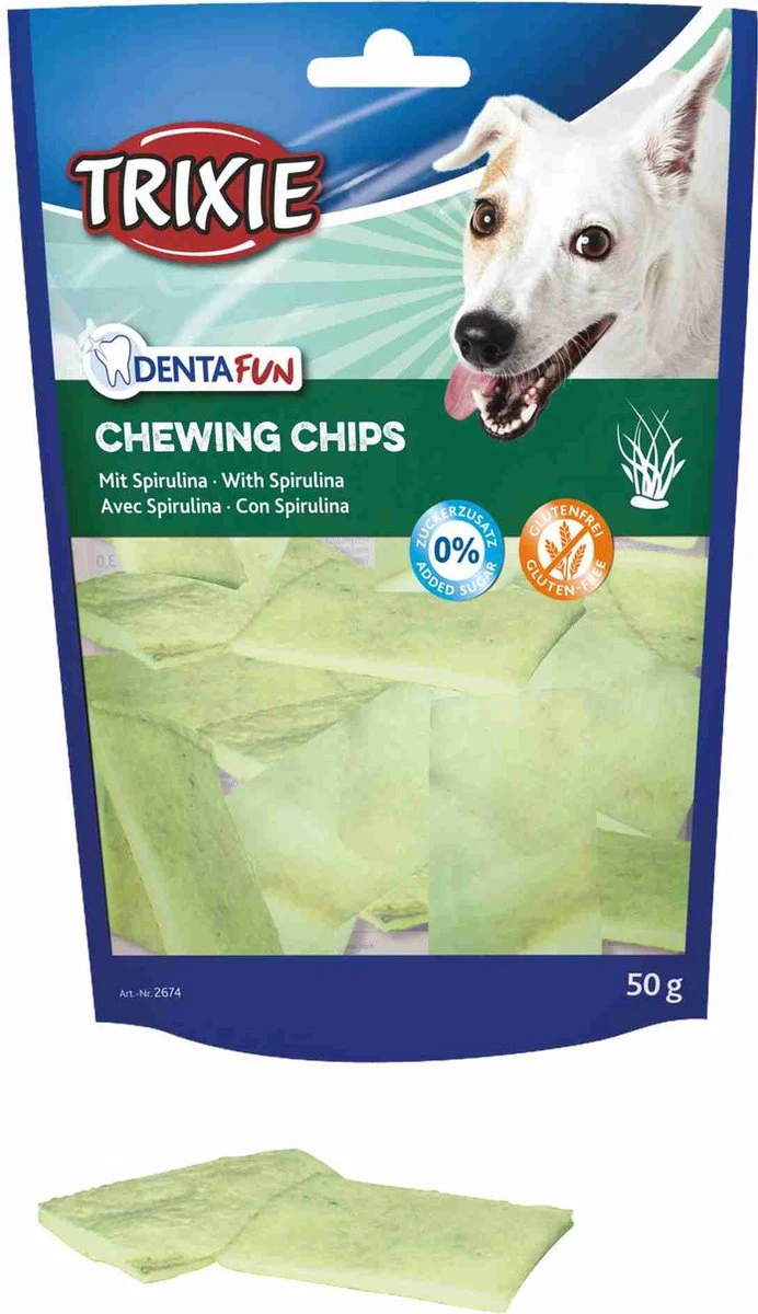 Denta Fun Spirulina Chewing Chips zijn gebitsverzorgende snacks met waardevolle spirulina-algen die van nature rijk aan vitaminen en onverzadigde vetzuren zijn en het immuunsysteem ondersteunen. Deze snacks zijn gemaakt van runderhuid en glutenvrij.