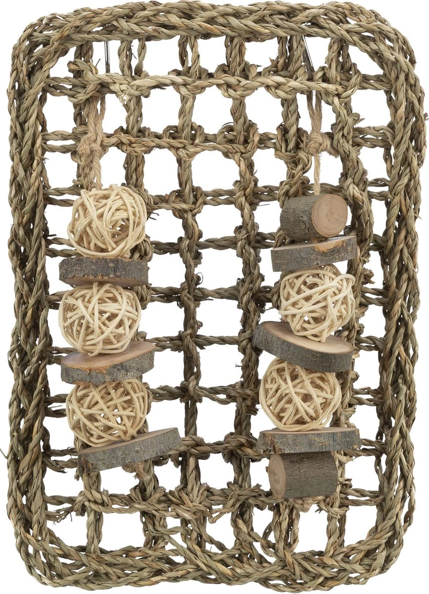 Trixie Knaagdier Mat Met Speeltjes Zeegras 18X30 cmDe Trixie Knaagdier Mat Met Speeltjes Zeegras 18X30 cm is een speeltje voor konijnen en knaagdieren met balletjes om aan te knagen. Verrijk het hok van jouw kleine vriendje met deze leuke mat! Hang het op in het hok en zie hoe jouw knager er plezier aan beleeft. Het gewoven zeegras is heerlijk om aan te knagen en de balletjes van hout en rotan maken het nog leuker!- Mat met speeltje- Speeltjes van hout en rotan- Verrijking van het hokAfmeting: 18X30 cm