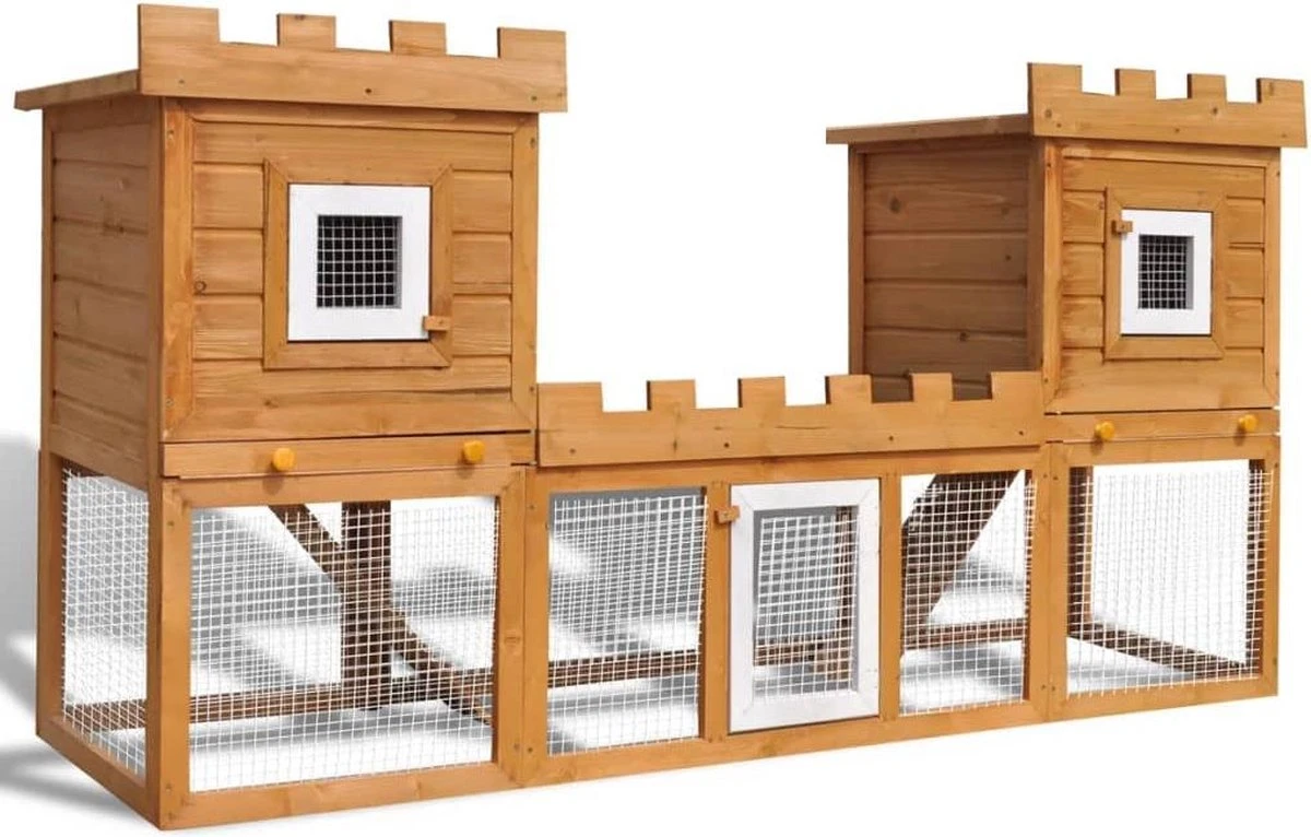 Het konijnenhok heeft een hoogwaardig grenenhouten frame, wat een langdurig gebruik garandeert. Het gezellige nachthok is het perfecte slaapgedeelte voor je huisdieren. Twee eenvoudig te beklimmen ladders leiden naar de bovenverdieping.