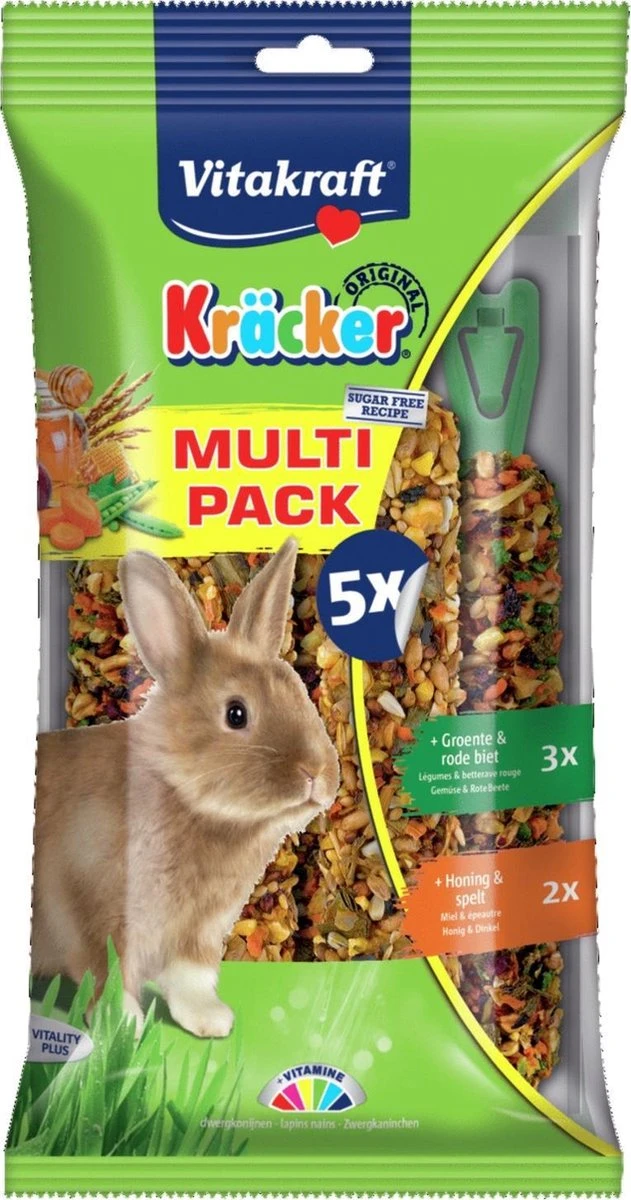 De orginele Multipack Vitakraft Kräckers zijn een verantwoorde lekkernij met 3 groente & biet Kräckers en 2 honing & spelt Kräckers. Ze bevatten lekkere granen, groente, biet, honing en spelt op een natuurlijk knabbelhoutje. De Kräckers zijn lekker van smaak en 3 keer gebakken waardoor de ingrediënten stevig vastzitten en het konijn moet werken voor zijn voedsel zoals in de natuur. Dit geeft het konijn de nodige beweging en zorgt ervoor dat hij zijn snijtanden op natuurlijke wijze kan afslijten. De Kräckers zijn op de voedingsbehoeften van het konijn afgestemd. Het Vital-Complex voorkomt gebreksverschijnselen en zorgt voor extra vitaliteit van het dier. De Kräckers bevatten waardevolle vitamines en zijn volgens een suikervrije receptuur bereid.
