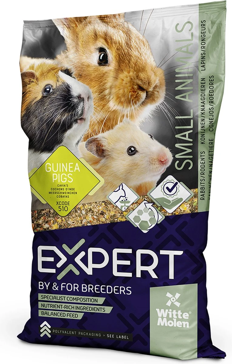 Een cavia heeft ongeveer 30 gram voer per kilogram lichaamsgewicht per dag nodig, afhankelijk van de levensfase en leefomstandigheden. Zorg dat de dieren alle ingrediënten opeten. Geef altijd onbeperkt toegang tot hooi en vers drinkwater. Product droog, koel en donker bewaren.