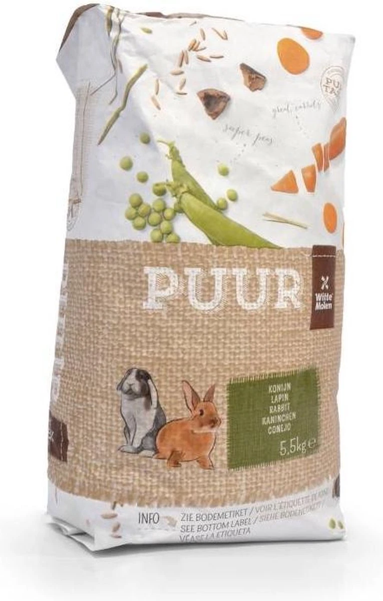 Puur Konijn van Witte Molen is een volledige voeding voor uw (dwerg)konijn zonder kunstmatige kleurstoffen en bewaarmiddelen. Het bevat onder andere wortel, timothy, selder, oregano en komkommer. De evenwichtige vezelrijke samenstelling, toegevoegde vitamines en sporenelementen zorgen voor extra vitaliteit. De ruwe ongemalen vezels en prebiotica dragen bij tot een gezond gebit en spijsvertering.