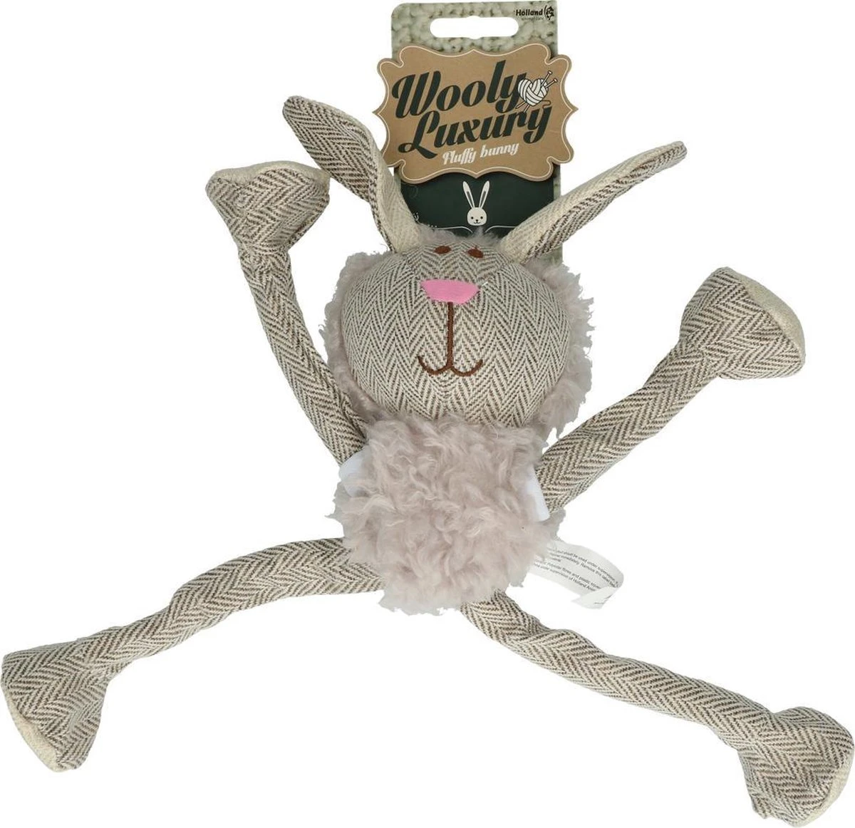 Dit knuffelkonijn is gemaakt van superzachte fleece en duurzaam en sterk canvas. Met een squeaker voor extra speelplezier. Met extra lange armen en benen van canvas om mee te gooien en om trek-spelletjes mee te spelen. De armen en benen bevatten een flos-touw en kunnen langer en korter gemaakt worden.