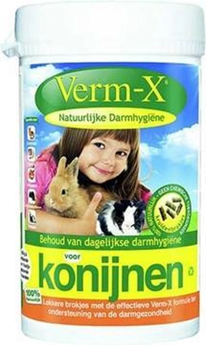 Voor een gezonde wormbalans Verm-X brokjes voor konijnenGezonde brokjes voor een goede darmhygiëne.Met prebiotica en probiotica. Verm-X voor konijnen is ook geschikt voor cavia’s, hamsters en alle andere haasachtigen en knaagdieren. Verm-X is een kruidenpreparaat ter verzorging en optimaal in conditie houden van de darmen. Verm-X is samengesteld uit verschillende kruiden die van oudsher gebruikt worden voor een goede darmhygiëne. Dieren in hun natuurlijke leefomgeving krijgen door een grote variatie aan voeding precies de juiste samenstelling van kruiden binnen. Zij doen als het ware aan zelfmedicatie. Verm-X is gebaseerd op deze manier van zelfmedicatie op basis van voedselkeuze.
